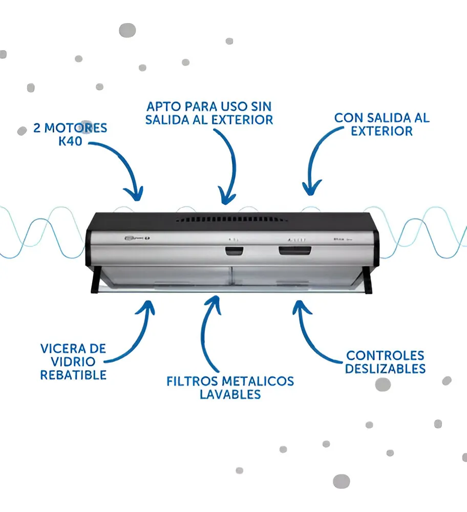 El Spar BIOS 3781 es un purificador de aire que cuenta con 2 motores y 3 velocidades de potencia de extracción. Gracias a su filtro antigrasa metálico y a su filtro de carbón activado opcional, lo que hace es aspirar el aire, absorber los malos olores y recircularlo. Además, tiene luz para iluminar la cocina y facilitar la cocción de alimentos. Y también dispone de visera móvil de vidrio biselado y comandos deslizantes.
