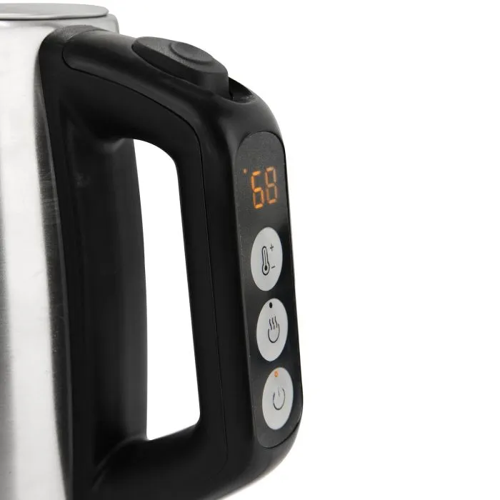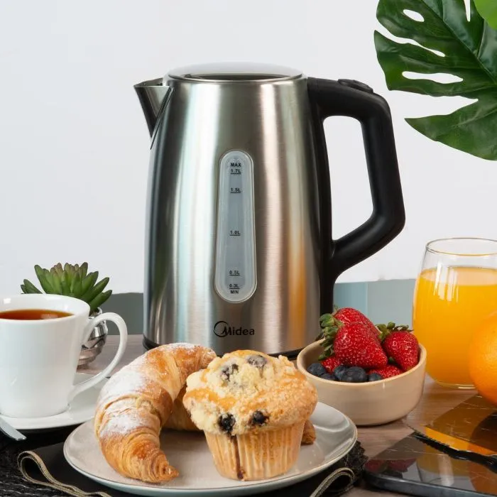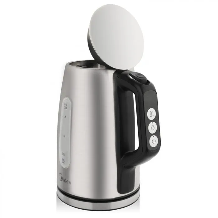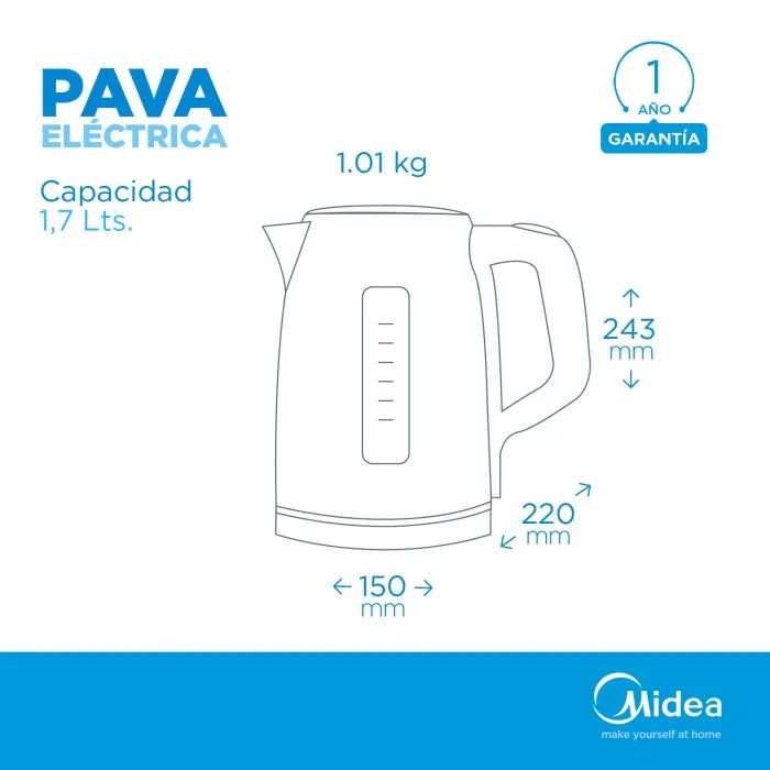 La línea de pavas Midea tiene una capacidad de 1.7L, potencia máxima de 1850 watts, control digital y apagado automático de seguridad.