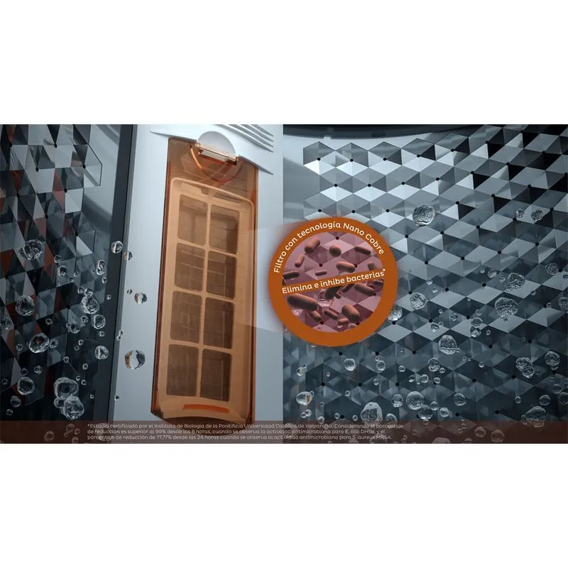 Su filtro de pelusas con tecnología Nano Cobre, elimina e inhibe hasta un 99% de las bacterias acumuladas en el filtro. Disfrutá de un ambiente de lavado limpio e higienizado.