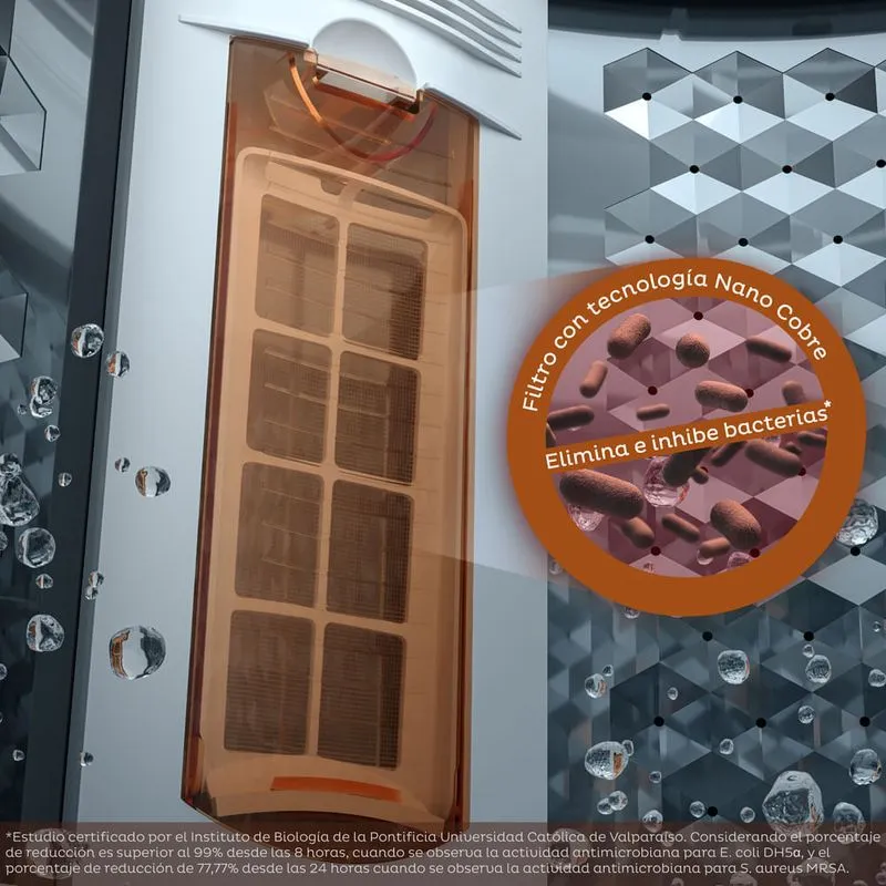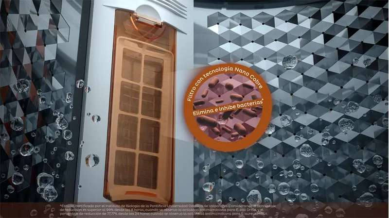 CUENTA CON TAMBOR DE ACERO INOXIDABLE HEXA DRUM, MÁS RESISTENTE Y DISEÑADO PARA CUIDAR MEJOR LAS TELAS. INCORPORA FILTRO DE PELUSAS CON TECNOLOGÍA NANO COBRE, QUE ELIMINA E INHIBE HASTA EL 99% DE LAS BACTERIAS, MANTENIENDO UN LAVADO MÁS HIGIÉNICO.