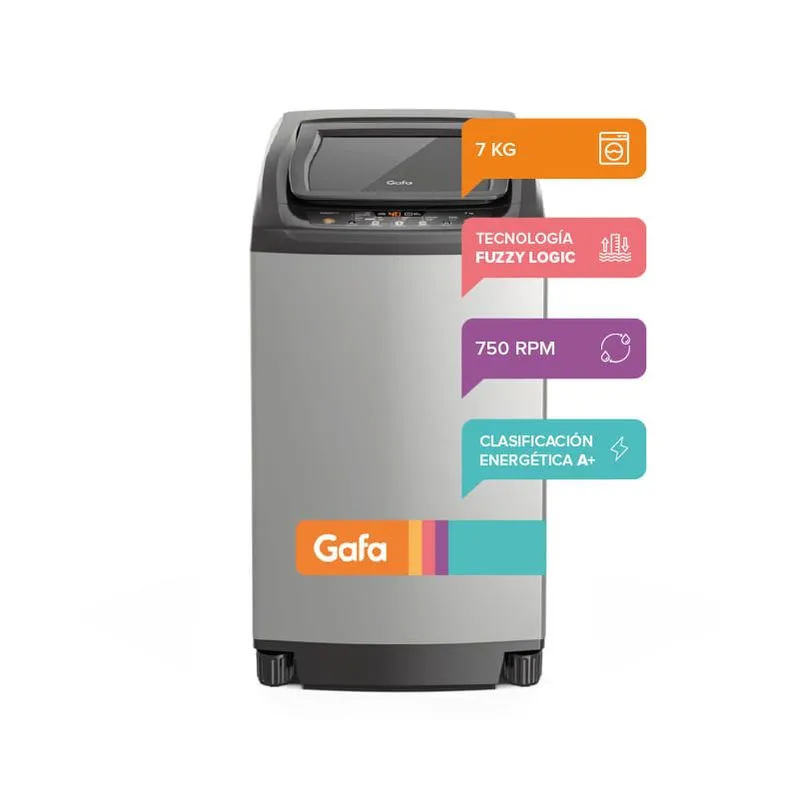 EL LAVARROPAS GAFA FUZZYFIT DE CARGA SUPERIOR 7 KG OFRECE UN LAVADO INTELIGENTE Y EFICIENTE, IDEAL PARA EL CUIDADO DIARIO DE TU ROPA. GRACIAS A SU SISTEMA FUZZY LOGIC, DETECTA AUTOMÁTICAMENTE EL PESO DE LAS PRENDAS Y AJUSTA LA CANTIDAD DE AGUA, OPTIMIZANDO EL TIEMPO DE LAVADO Y EL CONSUMO.