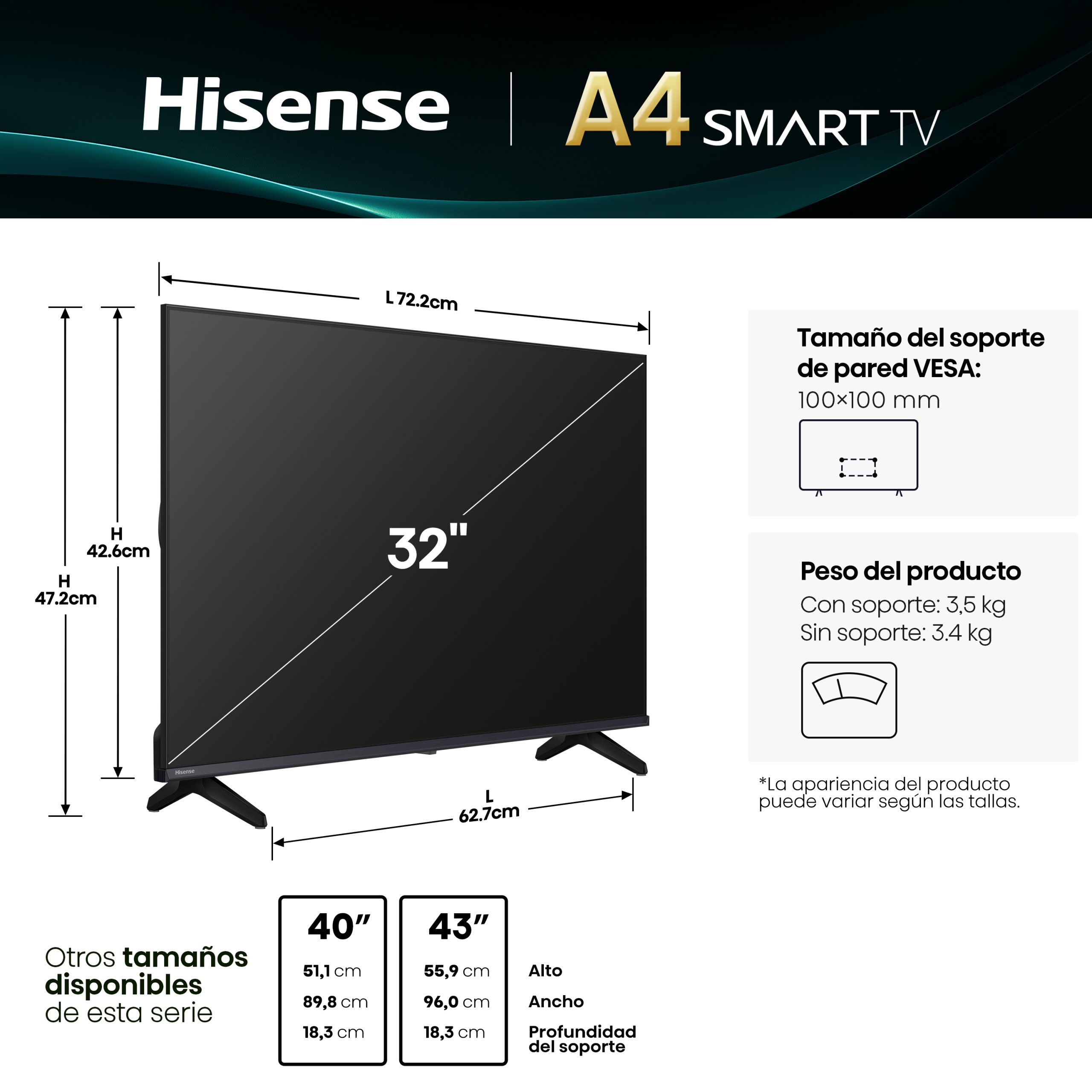 Pantalla LED de 32″ con resolución HD 1366 768 píxeles.