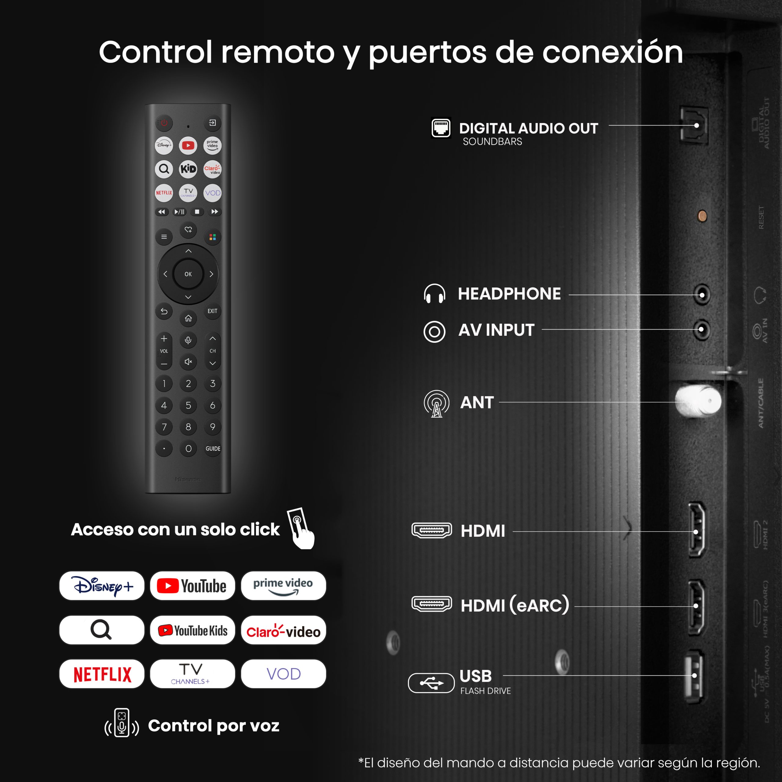 Sistema operativo VIDAA con acceso a Netflix, YouTube, Disney+ y más.
